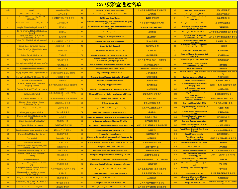 CAP国内通过的最新数据是121家(详见后续详细名单)(查询路径https://www.cap.org/laboratory-improvement/accreditation/accredited-laboratory-and-biorepository-directory/)。